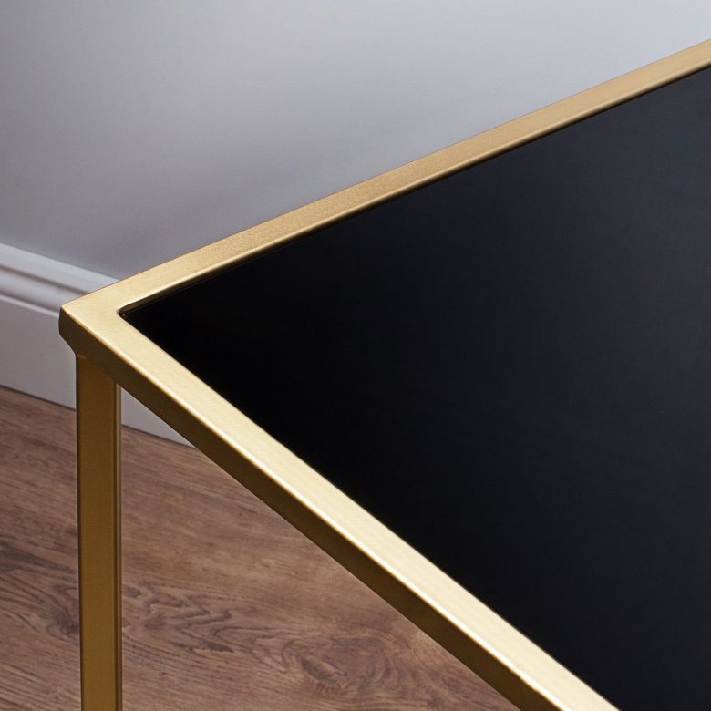 Лаконичный столик высотой 55 см — очень многофункциональная деталь в интерьере. Он может служить журнальным столиком в гостиной, прикроватной тумбой в спальне или стильной подставкой для крупного растения. Металлический корпус в золотом цвете идеально сочетается с квадратом 50х50 см черной матовой столешницы, обрамленной золотой рамкой. Такой дизайн хорошо будет смотреться как в роскошной обстановке, так и в скандинавской простоте или нарочитой небрежности лофта.